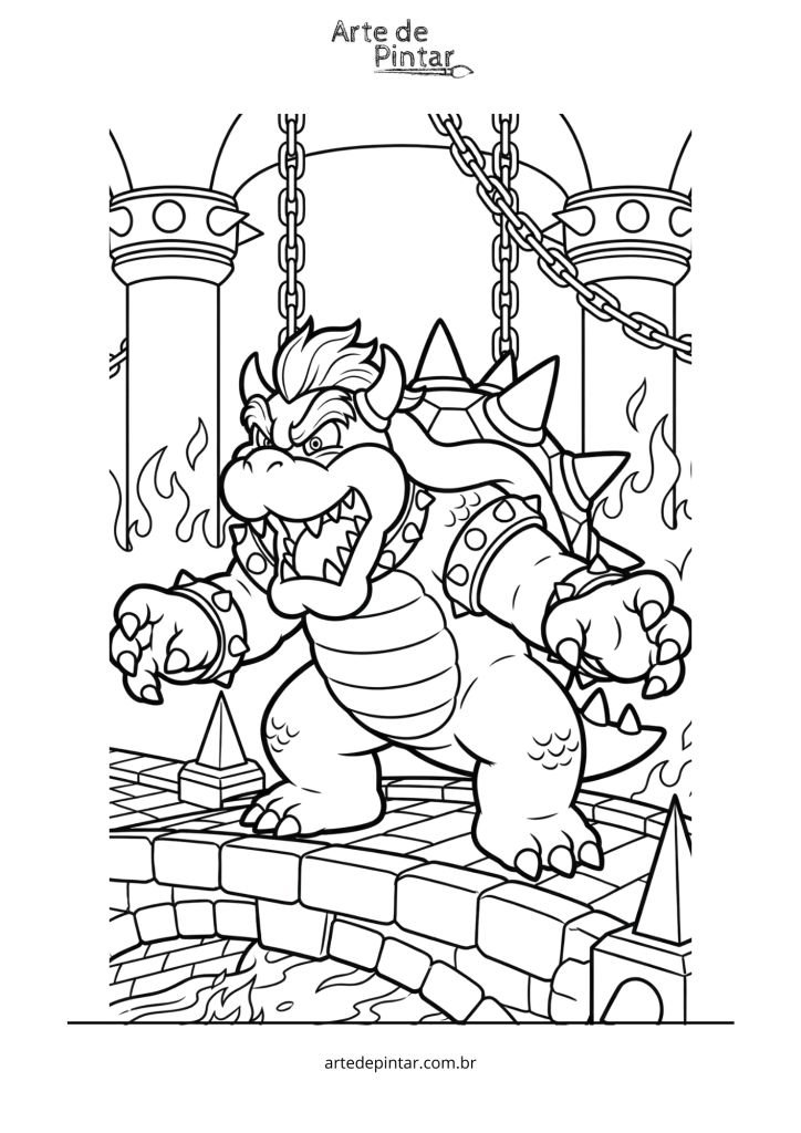 Bowser aparece poderoso em seu castelo cheio de mistérios — um desenho cheio de ação para as crianças colorirem e soltarem a imaginação!